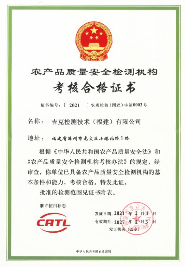 吉克檢測(cè)技術(shù)(福建)有限公司,位于福建省漳州市龍文區(qū)小港北路1號(hào),于2019年8月注冊(cè)成立,是一家獨(dú)立的第三方檢測(cè)公司。公司已經(jīng)通過檢驗(yàn)檢測(cè)機(jī)構(gòu)計(jì)量認(rèn)證(CMA)、農(nóng)產(chǎn)品質(zhì)量安全檢測(cè)機(jī)構(gòu)資質(zhì)認(rèn)證(CATL),獲得中國合格評(píng)定國家認(rèn)可委員會(huì)(CNAS)認(rèn)可。公司本著“嚴(yán)謹(jǐn)、規(guī)范、高效、協(xié)作”的原則和對(duì)客戶及社會(huì)高度負(fù)責(zé)的精神,充分利用本公司優(yōu)質(zhì)的檢測(cè)環(huán)境、先進(jìn)的檢測(cè)設(shè)備和專業(yè)的技術(shù)人員,第一時(shí)間為客戶提供科學(xué)、公正、準(zhǔn)確的檢驗(yàn)檢測(cè)報(bào)告。 公司實(shí)驗(yàn)室面積1100多平方米,儀器設(shè)備兩百多臺(tái)(套),固定資產(chǎn)一千多萬元,在職員工31人,技術(shù)人員中的中高級(jí)職稱及同等能力人數(shù)占60%以上。我們的服...